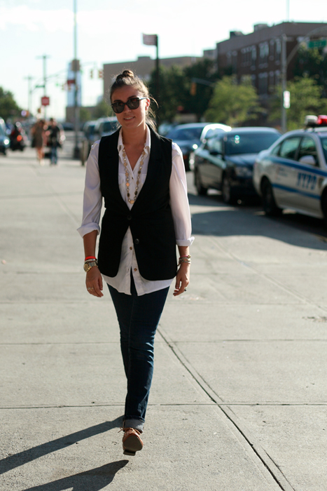 10 a.m.: Unexpectedly summoned from the office to Milk Studios. The sun is shining - and I'm in my Persols, brogues, cuffed dark skinnies, a white button-down and my sleeveless blazer. (Kiki bun in full effect.)